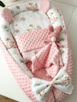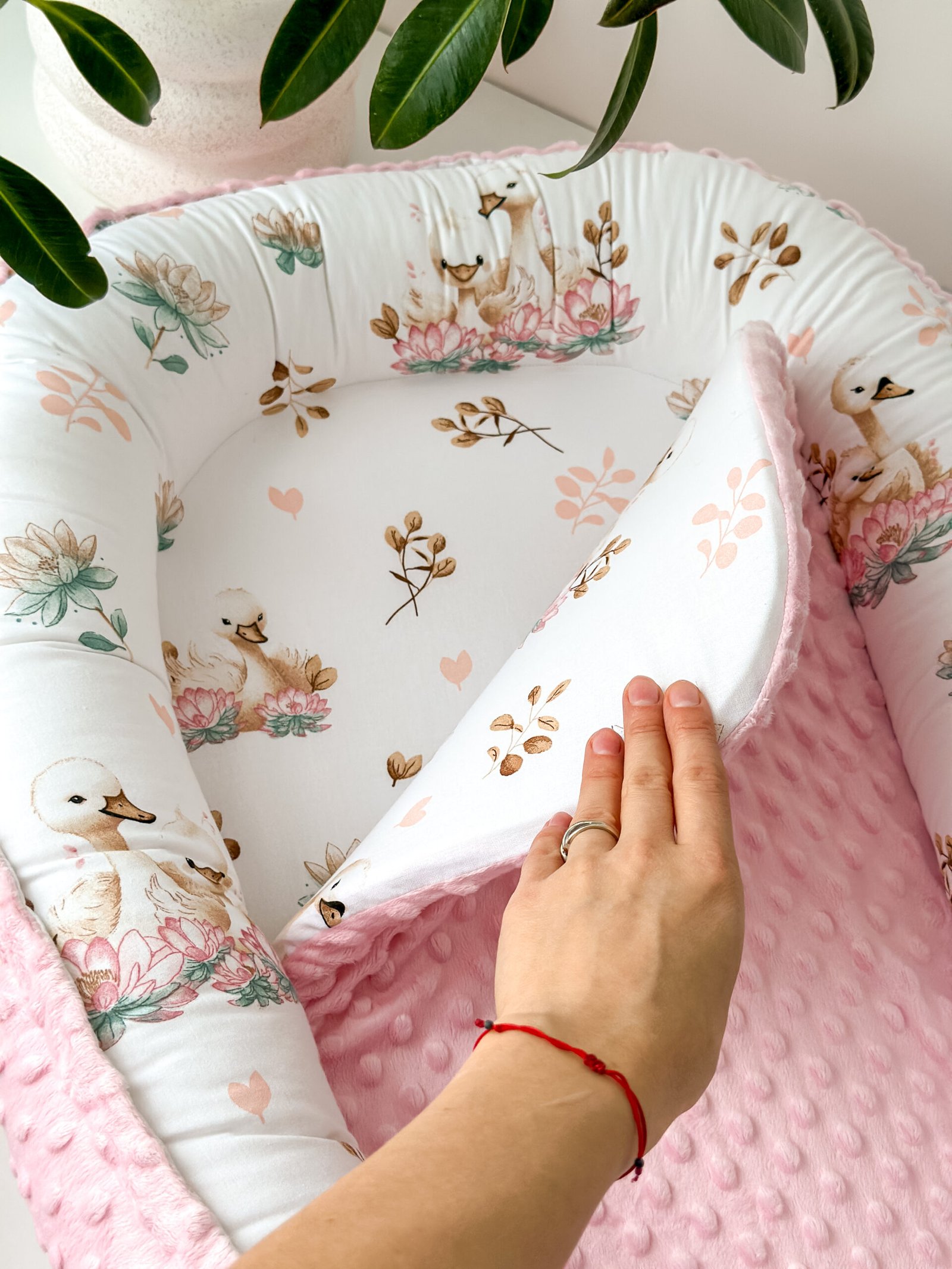 Šoninį sutraukimo lygį galima patogiai reguliuoti dekoratyvine virvele. Standartiškai, lizdelį siūname dvipusį su dvipusiu nuimamu čiužinuku (viena pusė Minky audinys, kita 100 proc. medvilnė), todėl galima sukurti net 4 skirtingus spalvų variantus.