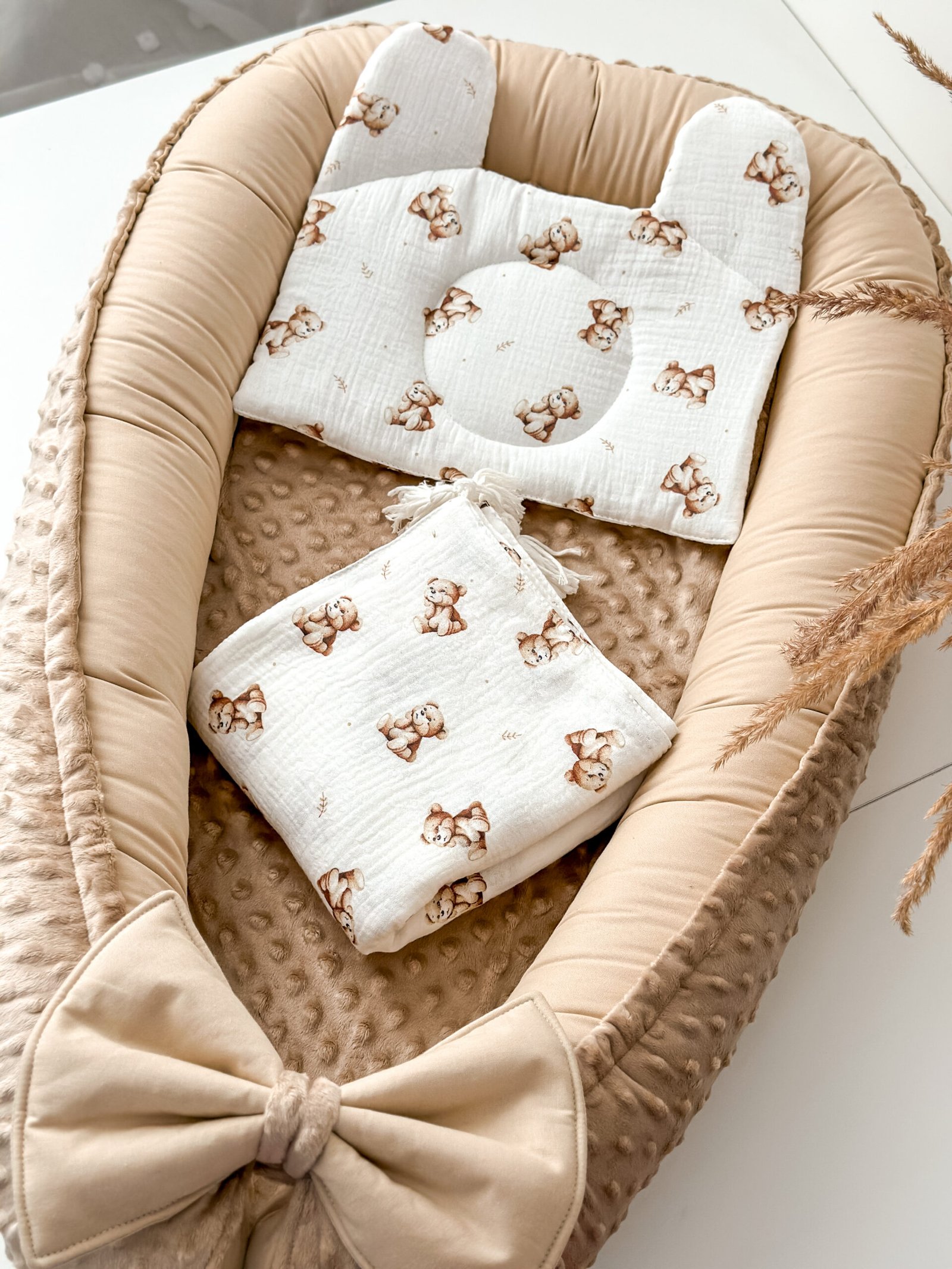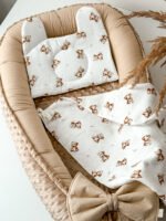 Muslino komplektas “Meškutis svajotojas”, pasiūtas iš 100% minkštos, lengvos medvilnės muslino, skirtas naudoti vežimuke, kokoniuke, lopšelyje, lovytėje ir kitur.