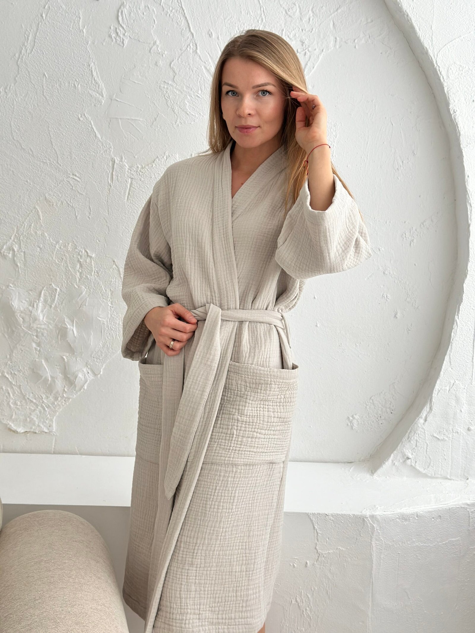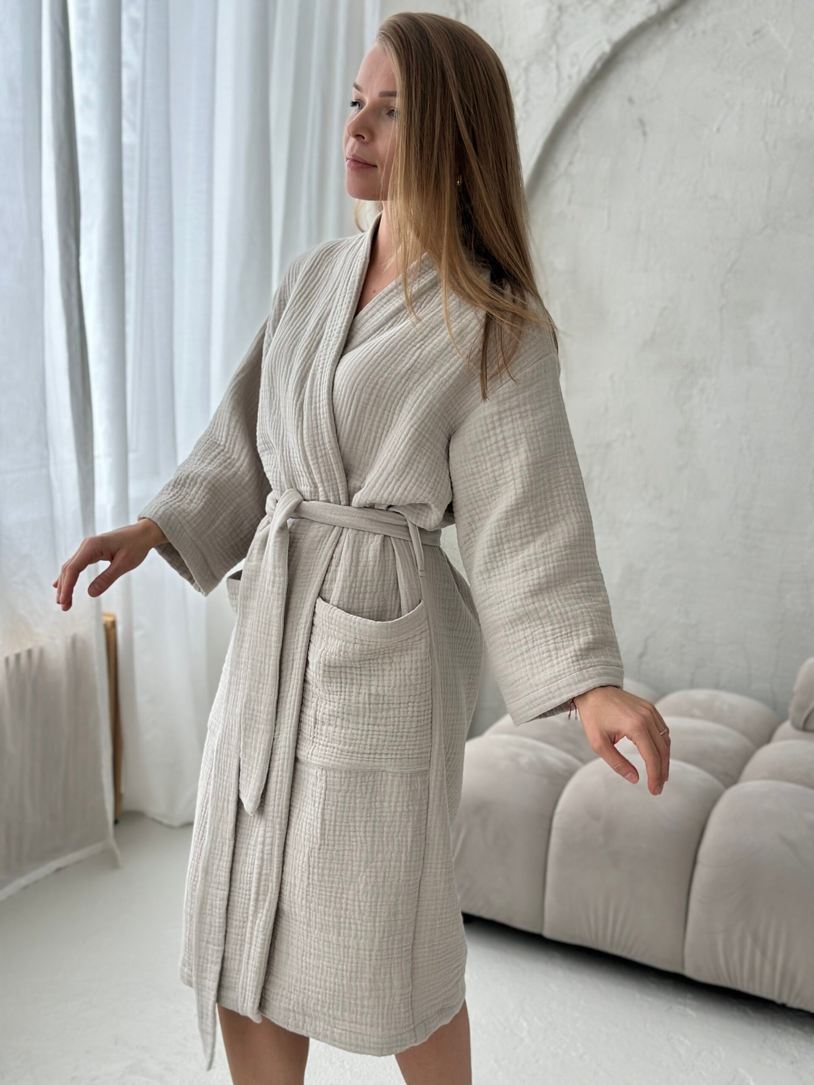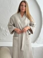 Šis muslino chalatas moterims pagamintas iš aukštos kokybės pirmos klasės OEKO-Tex medvilnės. Muslinas pasižymi puikiu oro pralaidumu, todėl chalatas komfortiškas tiek šiltuoju, tiek šaltuoju sezonu. Lengvai krintantis audinys maloniai priglunda prie kūno, kvėpuoja ir greitai džiūsta, todėl chalatas puikiai tinka tiek namų poilsiui, tiek vonios ritualams.