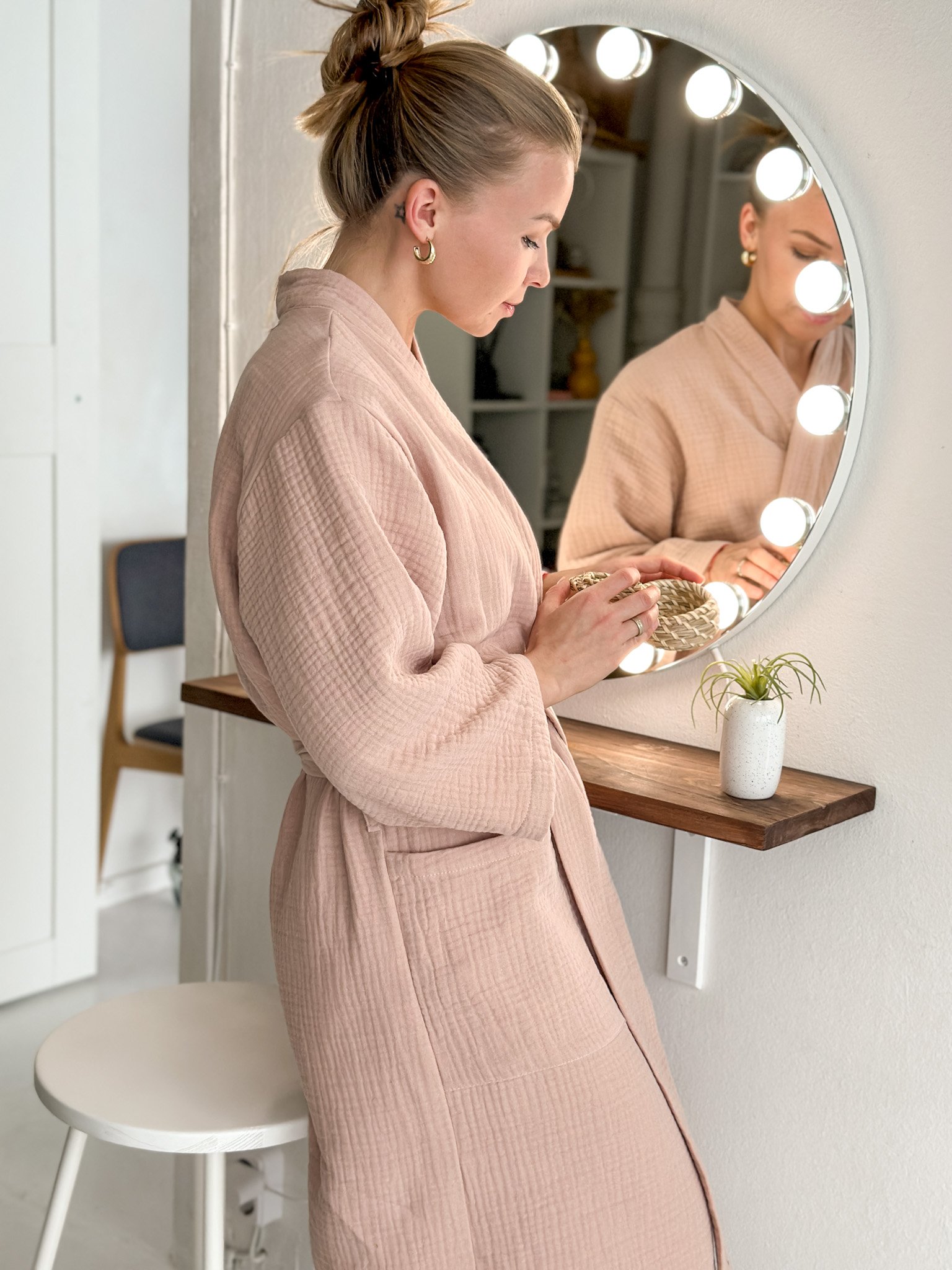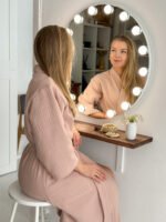 Šis muslino chalatas moterims pagamintas iš aukštos kokybės pirmos klasės OEKO-Tex medvilnės. Muslinas pasižymi puikiu oro pralaidumu, todėl chalatas komfortiškas tiek šiltuoju, tiek šaltuoju sezonu. Lengvai krintantis audinys maloniai priglunda prie kūno, kvėpuoja ir greitai džiūsta, todėl chalatas puikiai tinka tiek namų poilsiui, tiek vonios ritualams.