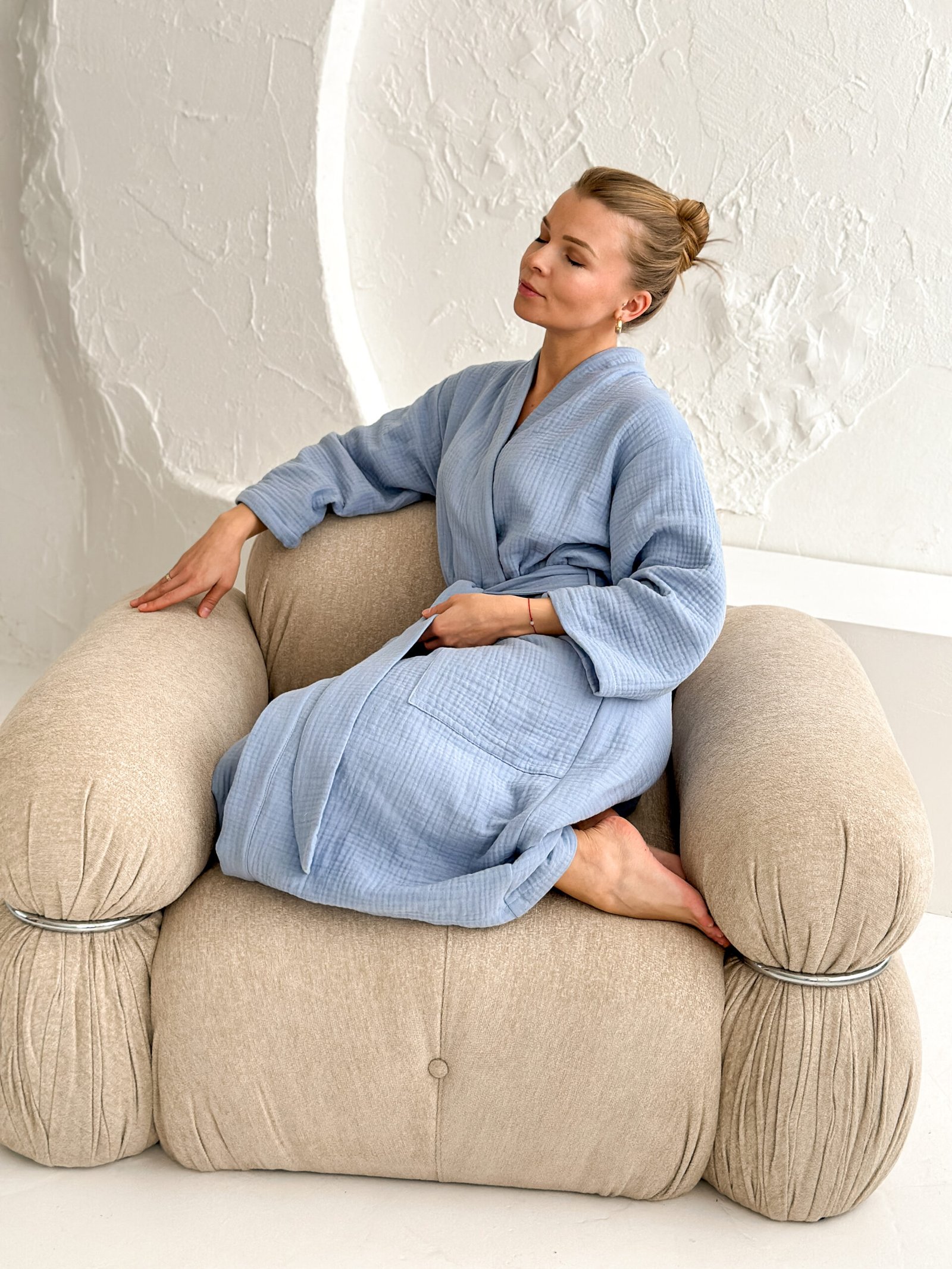 Šis muslino chalatas moterims pagamintas iš aukštos kokybės pirmos klasės OEKO-Tex medvilnės. Muslinas pasižymi puikiu oro pralaidumu, todėl chalatas komfortiškas tiek šiltuoju, tiek šaltuoju sezonu. Lengvai krintantis audinys maloniai priglunda prie kūno, kvėpuoja ir greitai džiūsta, todėl chalatas puikiai tinka tiek namų poilsiui, tiek vonios ritualams.