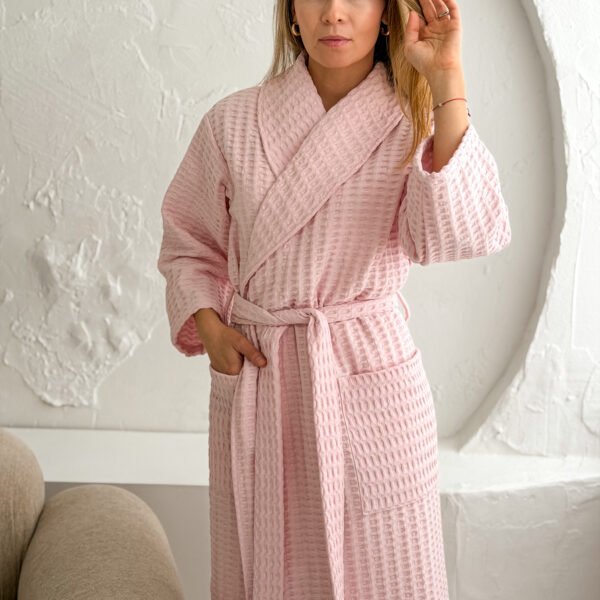Vaflinis Medvilninis Moteriškas Chalatas – Prigesinta Rožinė